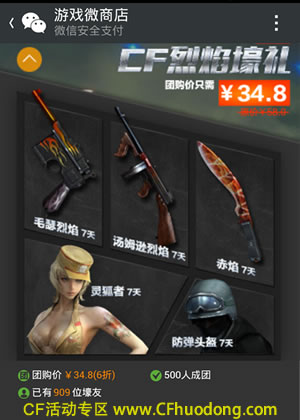 CF微商店举行团购活动,CF烈焰壕礼原价58元,团购价格34.8元(6折)。