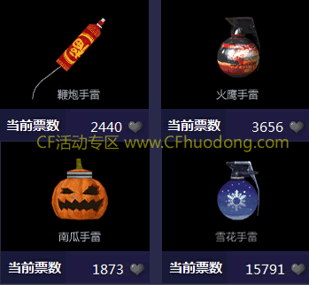 这一期的活动里,还可以投票选择下期QQ浏览器CF专题活动的奖励。目前是雪花手雷最受欢迎。
