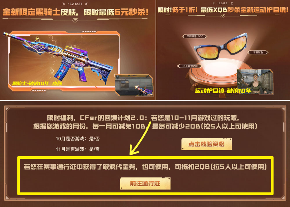 破浪十年代金券,用于在12月CF好友积分环节里,抵扣购买黑骑士-破浪10年皮肤、运动护目镜-破浪10年: