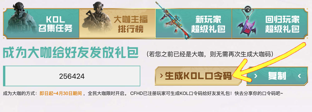 点击“大咖主播排行榜”按钮,点击“生成KOL口令码”: